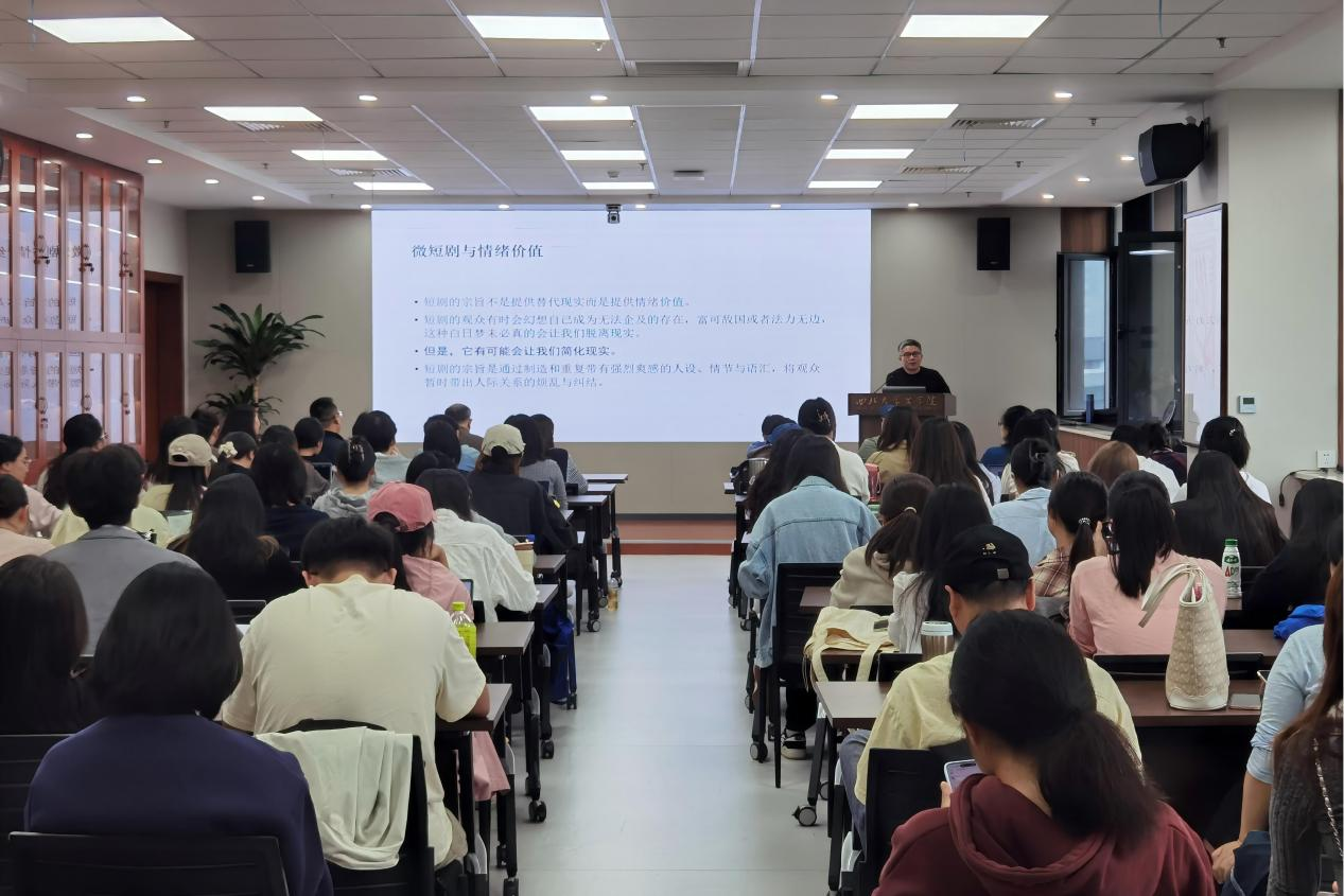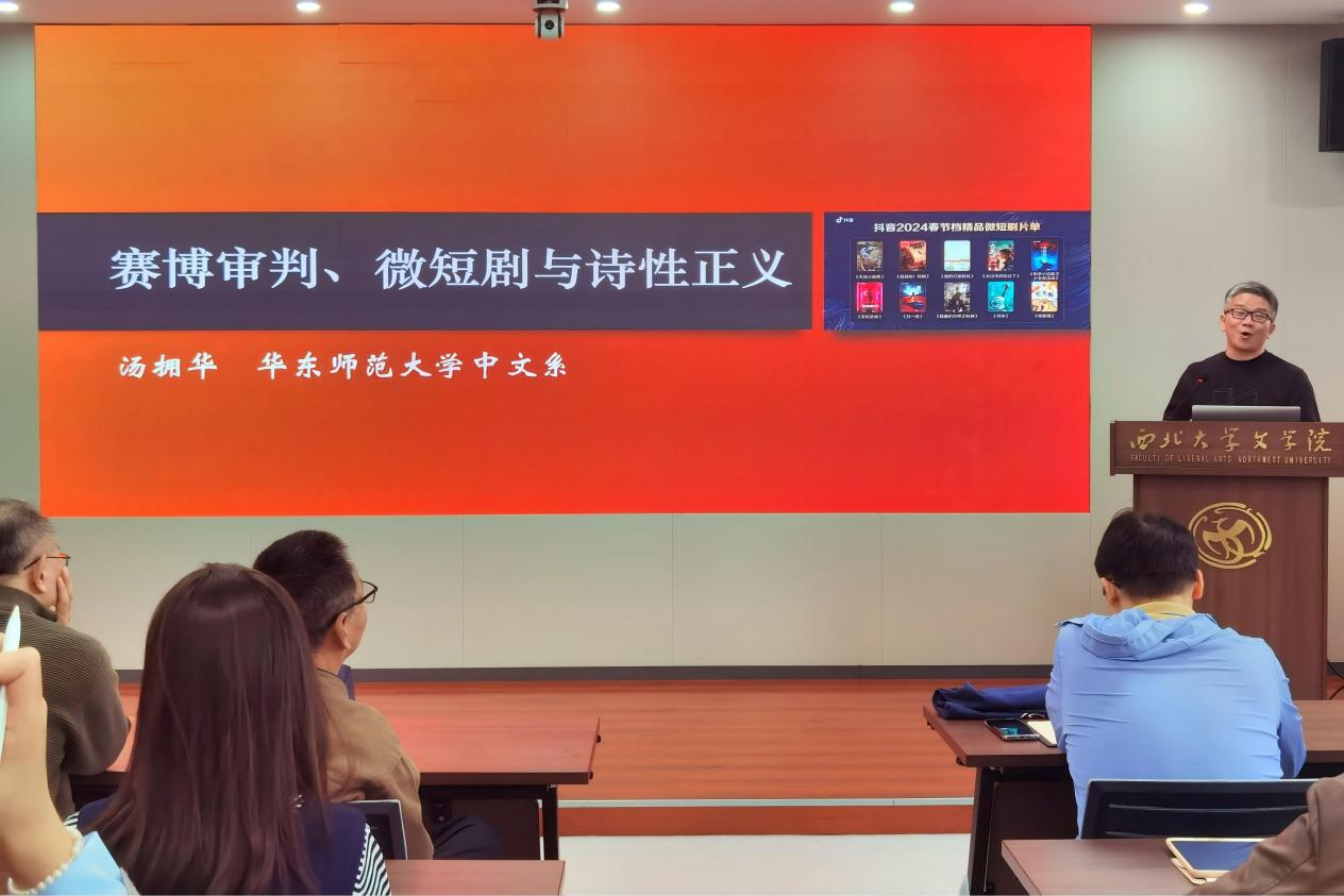 9月27日上午,华东师范大学中文系教授、文艺学博士生导师汤拥华教授做客我校,以“赛博审判、微短剧与诗性正义”为题展开探讨。讲座由姜彩燕老师主持,雷鸣老师、高俊林老师、袁少冲老师、赵林老师、李斌老师、薛凌老师到场聆听,60余名本硕博学生齐聚文学院第一会议室,共享学术盛宴。