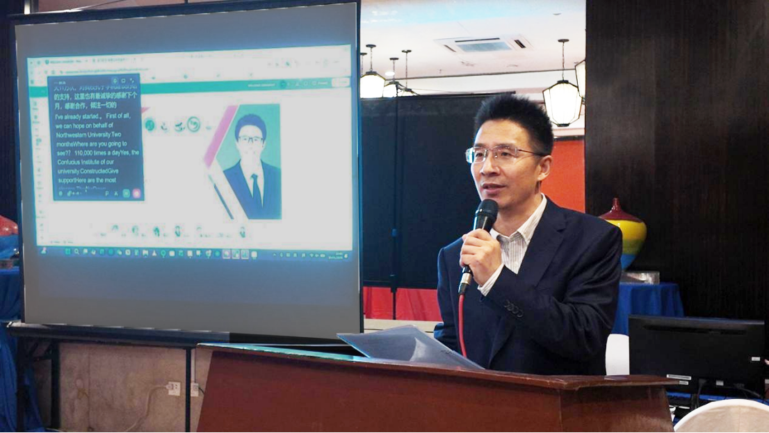 西北大学文学院院长谷鹏飞教授随后致辞,谷鹏飞院长介绍了文学院的学科优势及国际中文教育领域的成果,强调高校教育合作与实习实践是中国语言文化海外传播的重要载体,表达了与布拉卡国立大学深化合作、共促文化交流的真诚意愿。