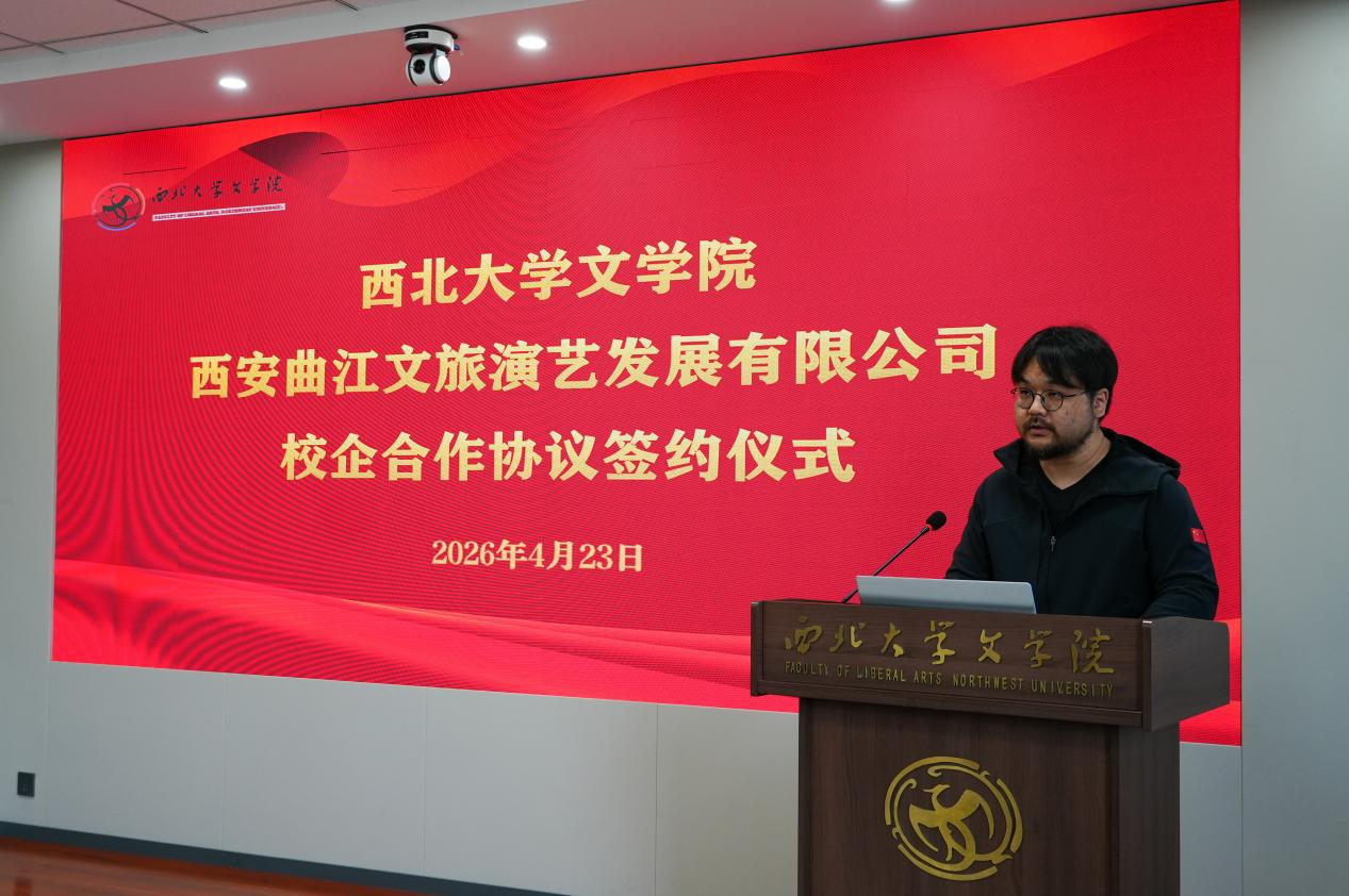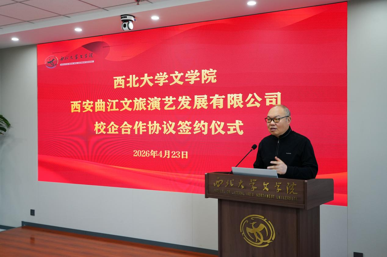 2026年4月23日上午,西北大学文学院与西安曲江文旅演艺发展有限公司校企合作协议签约仪式在西北大学长安校区文学院第一会议室隆重举行。此次合作旨在深化产教融合,推动高校戏剧影视专业人才培养与演艺行业需求的有效对接。仪式由西北大学文学院工会主席、戏剧戏曲教研室主任高字民副教授主持。