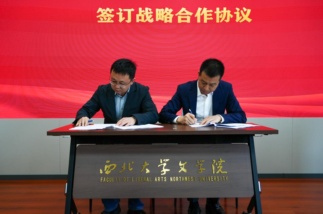 仪式上,西北大学文学院副院长杨遇青教授与西安曲江文旅演艺发展有限公司总经理陈朋先生代表双方正式签署战略合作协议,标志着两家单位在人才培养、实践教学、文化创作等领域的深度合作正式落地。
