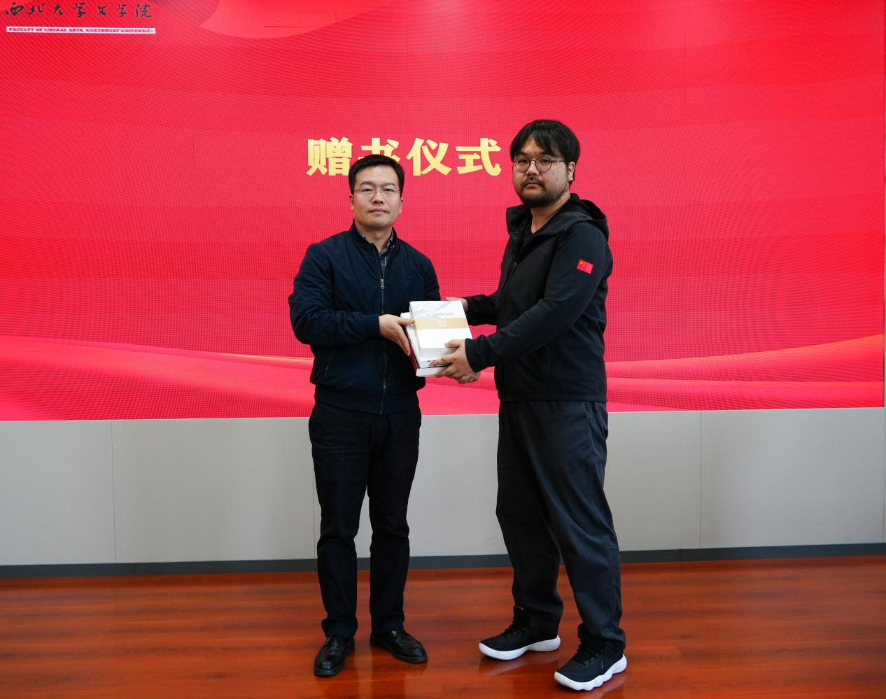 签约仪式恰逢4月23日世界图书日。仪式最后,文学院党委副书记陈柯老师代表学院,向西安曲江文旅演艺发展有限公司赠送了一批涵盖戏剧影视学科建设、实践教学及艺术美育方向的学术丛书,以书籍为纽带,为校企合作增添了文化的温度。