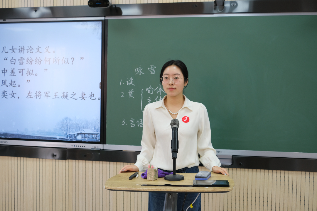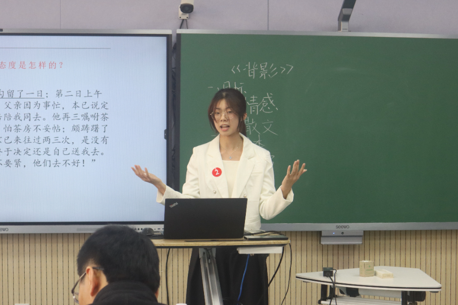 比赛分为“无生试讲”与“现场答辩”两大环节,全程井然有序、亮点纷呈。在15分钟的“无生试讲”环节中,11位选手分别围绕小学、中学语文课程内容,自主完成教学设计,通过课堂导入、新知教学、互动提问、总结升华、作业布置等完整教学流程,充分展现了教学目标设定、教学重难点突破及课堂互动设计能力。板书设计简洁美观、教学语言生动流畅、教学方法灵活多样,部分选手还融入了情境教学、小组讨论等创新形式,展现了新时代准教师的教学创新思维。
