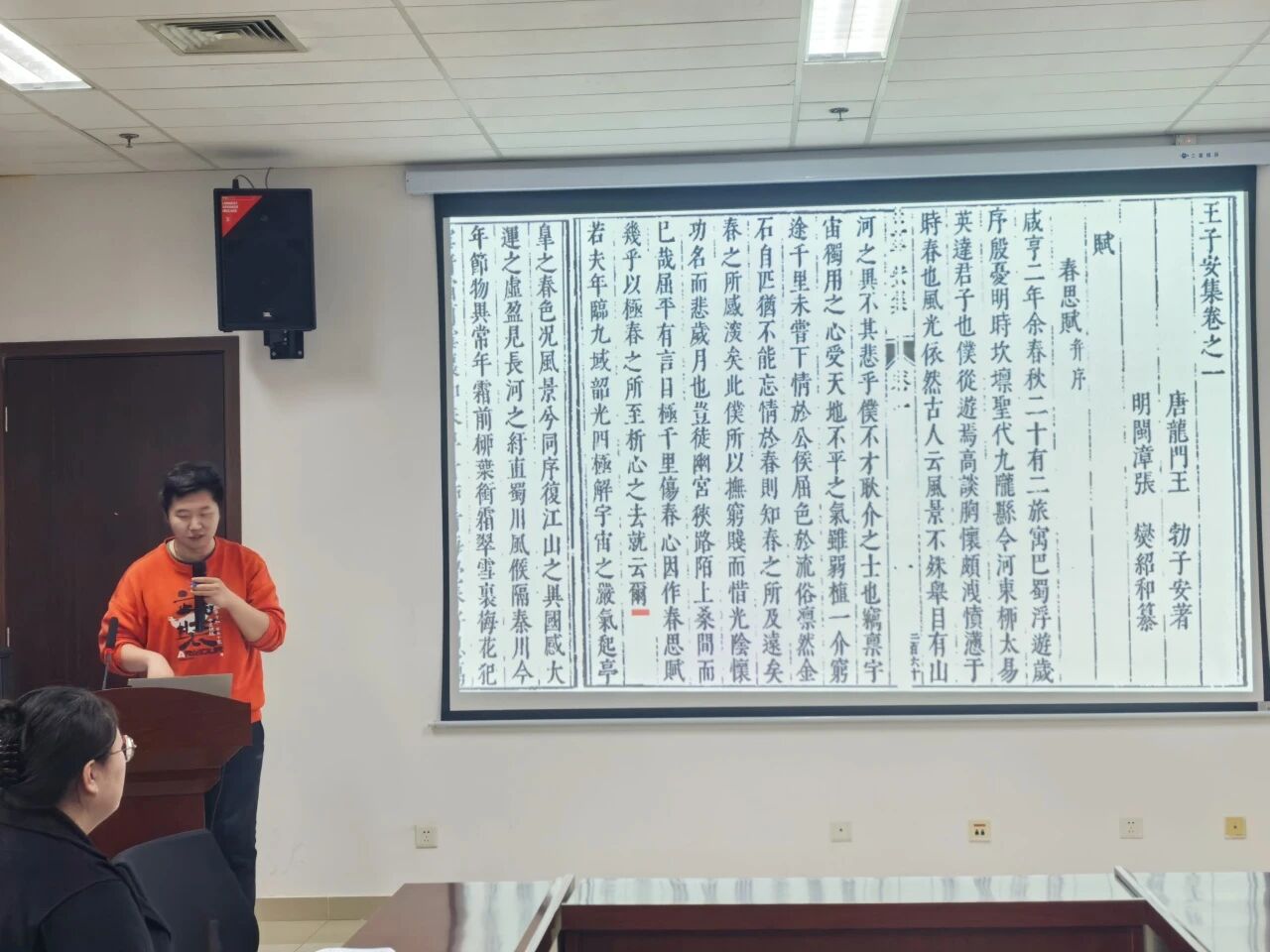 王坤泽同学以庾信的《春赋》和王勃的《春思赋》为例,引领我们探寻从南北朝至初唐时期,古人笔下的春天所经历的审美嬗变。他首先解析了庾信的《春赋》,这篇作品承袭了六朝骈文精工典丽的传统,通过对花开鸟鸣等自然物候的细腻铺陈,勾勒出一幅明媚喧妍、生机盎然的春日图景。进而,他将视角转向王勃的《春思赋》,这篇初唐之作虽亦描绘春色,却已不满足于单纯的景物摹写,而是将游子思妇的离愁别绪、人生际遇的深沉感慨注入其中,使春天成为承载复杂情感的审美意象。通过这两篇赋体的对读,王坤泽同学为我们揭示了赋体文学中“春天”主题的演进脉络——从对自然景色的客观呈现,逐渐转向对主体心境的深度抒发,生动展现了古人如何将“春天”这一永恒的文学母题,开掘得愈发丰赡而深邃。