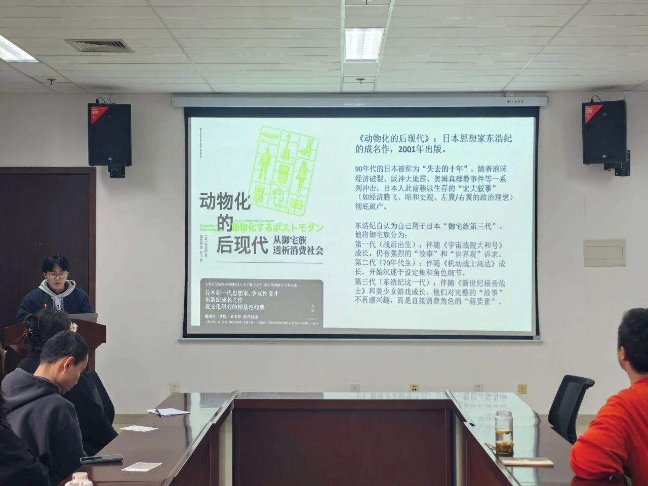 房新乐同学以日本后现代思想为切入点,分享了东浩纪《动物化的后现代》与宇野常宽《〇〇年代的想象力》两部著作,深入剖析了日本御宅族文化背后的社会心理变迁。他追溯东浩纪对御宅族三代的划分,指出在后现代“宏大叙事”破产的背景下,御宅族陷入“数据库消费”与“动物化”状态——人们不再追求完整的叙事,转而消费角色的“萌要素”,在虚构世界中寻求现实性,社会交往沦为信息交换,主体间性结构逐渐瓦解。然而,进入21世纪后,封闭的数据库想象被现实撕裂,宇野常宽提出“决断主义”的来临:在无法依赖宏大叙事的时代,人们必须通过“决断”确立自身立场,无论是“恶的决断”(如夜神月、鲁路修)强行将小叙事普遍化,还是“沟通的决断”在岛宇宙之间持续对话,都标志着从被动消费者向行动者的转变。房新乐同学由此反思当代人的生存困境——在冰冷却自由的世界中,如何拒绝他者回避,在流动的中间共同体中寻找连接,成为超越动物化的关键。他认为,阅读这两部著作,既能理解日本社会从“失去的十年”到“〇〇年代”的想象力演变,更能在“决断”的命题中照见自身,在春日里做出属于自己的选择。